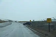 Land condemnation of the highway's right-of-way and additional land for future expansion was completed in January 2012, following additional negotiations with property owners and a hearing in the Natrona County District Court.[24][25] The $19.2 million contract (equivalent to $21.8 million in 2020 dollars)[13] to construct the first phase, including the North Platte River bridge, was awarded in March 2013 and grading was completed the following year.[26][27] The second phase to pave the new highway began in October 2014 with the awarding of a $16.6 million contract (equivalent to $18.2 million in 2020 dollars)[13] to a Utah firm.[28][29]