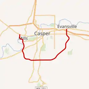 Wyoming Highway 258 begins its western end at US 20 Business/US 26 Business (Yellowstone Highway) in Mills and from there travels counter-clockwise around Casper.[2][3] WYO 258 heads south and crosses the North Platte River before intersecting W. 13th Street, which also provides access to Fort Casper. Continuing south, WYO 258 passes along the western side of the Central Wyoming Fair Grounds and briefly parallels the North Platte River a short distance before intersecting Wyoming Highway 220 (CY Avenue), the main artery for traffic coming into Casper from the west.[2] Past WYO 220, Highway 258 gradually turns eastward before reaching the southern terminus of Wyoming Highway 252 (S. Poplar Street). Under 1 mile later, Wyoming Highway 251 (Casper Mountain Road) is intersected which travels to Casper College and Casper Mountain.[4] Highway 258 continues east for a small distance and then begins to turn northeast as it travels around the southeastern outskirts of Casper and passes west of the Casper County Club.[3] Now mainly directed north, WYO 258 travels through the eastern neighborhoods of Casper and intersects busy east-west 2nd Street. Casper's Eastridge Mall lies on the southeastern side of this intersection. A third of mile north of that intersection, Interstate 25 is intersected at exit 185 as WYO 258 enters the Town of Evansville. Just past the interstate, WYO 258 reaches its eastern end at US 20/US 26/US 87 (Yellowstone Highway) after 10.58 miles (17.03 km). The roadway itself continues north as Curtis Avenue north through Evansville.