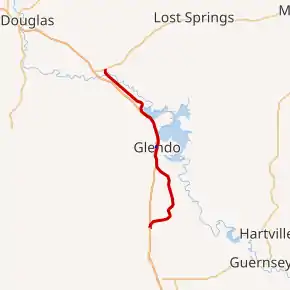 Wyoming Highway 319 is a north–south highway that follows the old Yellowstone Highway, therefore the current highway is named Old Yellowstone Highway. WYO 319 begins its south end at I-25 (exit 100) and from there heads northeast then north towards Glendo. At 6.21 miles (9.99 km) WYO 319 intersects a local road which heads west to exit 104 off I-25. Still heading north WYO 319 enters Glendo from the south, intersecting A Street at 14.16 miles (22.79 km). A Street is designated as WYO 319 Spur for 0.2 miles (0.32 km) between WYO 319 and Interstate 25 (exit 111). As Highway 319 leaves Glendo, at 15.4 miles (24.8 km) there is a road named Lake Shore Road that east of WYO 319 and allows access to Glendo State Park. Glendo State Park is one of Wyoming's most popular boating parks, and it offers visitors water-skiing, fishing, and other water-based activities as well as campsites, sanitary facilities, tables and grills.[2] Wyoming Highway 319 heads northwest and parallels Interstate 25 that lies to the west and the Glendo Reservoir/North Platte River that lies to the east. I-25 breaks its parallel and leaves to head more northwest towards Douglas, while Highway 319 turns north to come to an end at US 18/US 20 in Orin at 28.84 miles (46.41 km).[3][4]