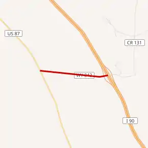 Wyoming Highway 342 begins its western end at U.S. Route 87 (unsigned WYO 344) and heads east for 1.14 miles and ends at Interstate 90 (exit 33).[2] Meade Creek Road itself continues another 3.7 miles to end at U.S. Route 14 northeast of here.[1]