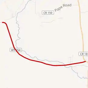 Wyoming Highway 354 begins its western end at Sublette CR 112 (Daniel-Merna Road) northwest of Daniel. Highway 354 turns southeasterly and follows the southern bank of the Green River. WYO 354 passes by the former site of Fort Bonneville, a fortified winter camp and fur trading post established in 1832, however no structure remains at the site today.[2] Nearing 5 miles, WYO 354 crosses the Green River. At 6.17 miles reaches its end at US 189/US 191 just west of their junction at Daniel Junction, north of Daniel.[3][4]