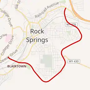 WYO 376 formerly continued in a counterclockwise direction from its current eastern terminus to connect back to the former U.S. Route 187 (Elk Street).[1] Since U.S. Route 191 (US 191) was routed onto Interstate 80/U.S. Route 30 (I-80/US 30) north of Rock Springs, that portion of Elk Street was unnumbered. However, Wyoming Department of Transportation (WYDOT) maintains the section of Elk Street between I-80 BL/US 20 Bus. and I-80/US 30. It is mile-marked in the highway log as US 191, although signage shows US 191 bypassing the town via I-80/US 30. The northeast corner of the circumferential highway is not currently maintained by WYDOT.[1]