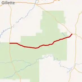 Wyoming Highway 450 begins its western end in the Town of Wright in Campbell County at Wyoming Highway 59, just south of the eastern terminus of Wyoming Highway 387.[2][3] Highway 450 heads due east through Thunder Basin National Grassland for much of its length. Nearing 21 miles, WYO 450 leaves Campbell County and enters Weston. The southern terminus of Wyoming Highway 116 is intersected at approximately 36.5 miles (58.7 km).[2] Nearing its eastern end WYO 450 reaches the City of Newcastle, the county seat of Weston County, where it ends at US Route 16.