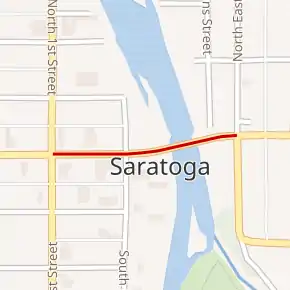Wyoming Highway 74 (WYO 74) is an extremely short unsigned Wyoming state highway known as East Bridge Avenue in the town of Saratoga. At just 0.13 miles (0.21 km) long, it is the shortest Wyoming state highway.