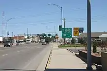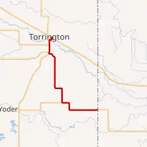 Highway 92 begins in downtown Torrington at an intersection with U.S. Routes 26 and 85.[3] Highway 92 proceeds southward, concurrent with US 85 Business. In one half-mile Highway 92 intersects mainline US 85 again, where US 85 Business ends and the concurrency with the mainline begins. The routes cross the North Platte River and intersects the eastern terminus of Highway 156 in an area known as South Torrington.[2] Leaving Torrington, the highway intersects the northern end of Highway 154 before splitting off from US 85. US 85 then continues south toward Cheyenne while Highway 92 turns east. Highway 92 travels southeasterly to the community of Huntley, a Census-designated place (CDP), where it intersects the eastern terminus of Highway 161 as the road turns east.[2] Highway 92 zig-zags southeast of Huntley where it intersects the western (northern) terminus of Highway 158 as it heads for the Nebraska state line.[2] At the Nebraska state border near Lyman, Nebraska the roadway continues east as Nebraska Highway 92.