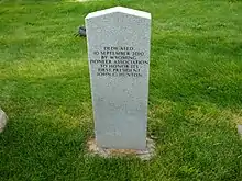 In 2010, John C. Hunton received a proper grave marker from the association. In 1839 Hunton was born in Madison, Virginia and served in the American Civil War prior to relocating to Wyoming. In addition to being the founding president, Hunton was one of Wyoming's first cattlemen. He worked many positions and started his own businesses throughout Wyoming Territory. His diaries "serve as some of Wyoming’s earliest historical documents". He helped found the Wyoming Stock Growers Association and the Cheyenne Social Club. In 1890, Wyoming achieved statehood, and helping found the Wyoming Pioneer Association was key to that goal. Hunton served as Laramie County Commissioner in Cheyenne. He died September 4, 1928, at 89 years of age and was buried in Cheyenne, Wyoming with only a small white stone with his initials marking the spot.[11][12] Association member and Cheyenne resident, Beverly Holmes, and retired Army Colonel Bob Fesack worked to facilitate the new marker, using Hunton's Civil War records to apply to the Veteran's Administration for the gravestone.[11] The new gravestone was installed next to the original marker in Westlake Cemetery.[12] Prior to the ceremony, there was a presentation at the Wyoming National Guard Museum, where retired U.S. Army Colonel Bob Bezek shared Hunton's military history. The unveiling then took place at Lakeview Ceremony. Hunton served in the Virginia Infantry for the Confederate Army, including a spell as a prisoner of war.[13]