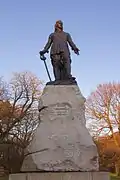 In 1968, a 7.16-metre (23.5 ft)-tall bronze statue of Oliver Cromwell on a granite plinth and pedestal was relocated to Wythenshawe Park. Sculpted by Matthew Noble, it had originally stood on Deansgate in Manchester city centre. From its inception, the statue had proved politically controversial, advocated by Radical Liberals but denounced by conservatives. Eventually its location was found to be obstructing traffic, and the statue was re-sited to Wythenshawe Park, commemorating Wythenshawe Hall's association with the Civil War. Within weeks, the statue was vandalised with paint and Cromwell's sword was stolen. The statue was listed Grade II in 1994 by English Heritage.[6][7][8][5]