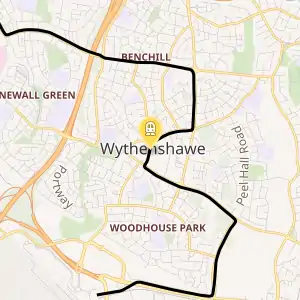 Wythenshawe Town Centre is a tram stop on the Manchester Metrolink Airport Line. It opened on 3 November 2014.[1] It is in Wythenshawe town centre next to shops, the library and Wythenshawe Forum. A new Wythenshawe bus station was built next to the Metrolink station,[2] which replaced existing stops at the former bus station and Wythenshawe Forum.[3]