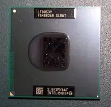 The first Xeon-branded processor was the Pentium II Xeon (code-named "Drake"). It was released in 1998, replacing the Pentium Pro in Intel's server lineup. The Pentium II Xeon was a "Deschutes" Pentium II (and shared the same product code: 80523) with a full-speed 512 kB (1 kB = 1024 B), 1 MB (1 MB = 1024 kB = 10242 B), or 2 MB L2 cache. The L2 cache was implemented with custom 512 kB SRAMs developed by Intel. The number of SRAMs depended on the amount of cache. A 512 kB configuration required one SRAM, a 1 MB configuration: two SRAMs, and a 2 MB configuration: four SRAMs on both sides of the PCB. Each SRAM was a 12.90 mm by 17.23 mm (222.21 mm²) die fabricated in a 0.35 µm four-layer metal CMOS process and packaged in a cavity-down wire-bonded land grid array (LGA).[2] The additional cache required a larger module and thus the Pentium II Xeon used a larger slot, Slot 2. It was supported by the 440GX dual-processor workstation chipset and the 450NX quad- or octo-processor chipset.