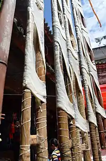 Unusual for China, the Bai people produce and eat cheese (乳扇) made from cow's milk and whey. Usually made in small batches and stretched out like a fan over parallel bamboo poles to dry in the sunlight, this cheese is eaten like a snack or used in cooking. It is also a main ingredient in the second course of the Three Course Tea ceremony. The Bai's cheese can be eaten fresh, dried, or fried and is usually served with a sweet sauce, sugar or rose jam.