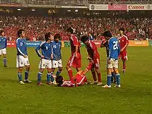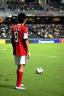 Xu was also a member of the Hong Kong squad for the 2010 East Asian Football Championship final competition because of his performance in the 2009 East Asian Games.[68] Nevertheless, Xu Deshuai didn't start in the first game against South Korea and came on to the field on the 85th-minute after Hong Kong had already given up four goals.[69][70] He played in the starting line-up in the second game against Japan. Xu Deshuai hit a dangerous-looking direct free kick caught by Seigo Narazaki in second half.[71] Hong Kong also lost by 3 goals.[72] He wasted a scoring opportunity during first half of the game against China.[73]