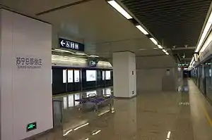 Xuzhuang/Suning HQ station (Chinese: 徐庄·苏宁总部站), also known simply as Xuzhuang station is a station on Line 4 of the Nanjing Metro. It opened on January 18, 2017 alongside seventeen other stations as part of Line 4's first phase.[1] The station is oriented on an east–west axis, underneath Suning Avenue and Donglai Street. The station is named after the nearby Xuzhuang Software Park and the headquarters of Suning Commerce Group, a Nanjing-based company.[2] A mural inside the station's mezzanine level depicts the software and technology industry of the titular software park.[3]