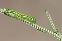 Larva bright green or olive brown; dorsal and subdorsal lines yellowish, the latter with three yellow tubercles above them on each segment; spiracular line yellow, black edged above, with the spiracles red. The larvae feed on various plants, including Rumex hydrolapathum, Centaurea, Iris, Cyperaceae and Polygonum.[2]