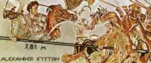 Macedonia possessed a skilled cavalry soldiers, known as the Hetairoi, who used the xyston spear as their main weapon.[2] Swords were only used as last resort.[2] The cavalry used their height advantage, sitting on top of the horse, to pierce the faces and upper bodies of enemy infantry with the xyston, rather than lower limbs and torso areas.[4] Alexander the Great is shown on horseback, wielding the xyston spear in the Alexander mosaic.[5]