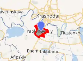Yablonovsky (Russian: Яблоно́вский; Adyghe: Яблоновскэ), informally called Yablonovka (Яблоно́вка), is an urban locality (an urban-type settlement) in Takhtamukaysky District of the Republic of Adygea, Russia, located on the left bank of the Kuban River across Krasnodar in Krasnodar Krai, 252 kilometers (157 mi) northwest of Maykop, the capital of the republic. As of the 2010 Census, its population was 26,171.[2]