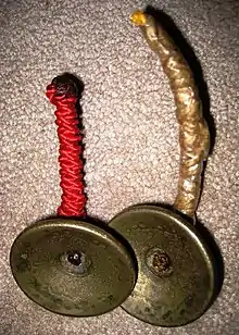 The Yakshagana bells (Kannada: ಯಕ್ಷಗಾನ ತಾಳಗಳು) or Yakshagana cymbal are a pair of finger bells made of a special alloy (traditional five metal) used in Yakshagana(Badagu Thittu). They are used by the singer to keep the tempo and rhythm of Yakshagana performance. The pitch of the bells are very high and do not match the tonic of the singer. Due to their high pitch usually singers use bells of any key. Professional singers maintain and treasure their personal finger bells.