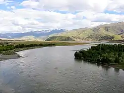 The Yalong has its source in the Bayan Har Mountains on the Tibet–Qinghai Plateau in Chindu County, Yushu, Qinghai, where it is known as the Za Qu (Chinese: 扎曲).[4] Flowing southeasterly, the Yalong gradually turns south at Garzê and travels between the Shaluli Mountains to the west and the Daxue Mountains to the east.[5] The Yalong River channel runs through a deep gorge for much of its length south of Garzê. The southern Sichuan-Tibet Highway crosses the Yalong at Yajiang in the middle of the river's course. In Liangshan Prefecture, the river wraps 150 km (93 mi) around the Jinping Mountains creating the Jinping Bend.[5] Here, water from the Yalong River has been diverted under the mountains as part of the Jinping-II Dam hydroelectric project. The Yalong meets the main stem of the Yangtze (Jinsha) River in Panzhihua, Sichuan.[6]