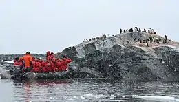 ![]() Tourist expedition Zodiac visits Adelie penguins in the Yalour Islands | |