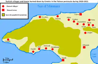 The Yalova Peninsula massacres were a series of massacres during 1920–1921, the majority of which occurred during March – May 1921. They were committed by local Greek and Armenian bands with the invading Hellenic Army,[2][7] against the Turkish Muslim population of the Yalova Peninsula.[7] There were 27 villages burned and in Armutlu.[2] According to journalist Arnold J. Toynbee c. 300 Muslims were killed during April–July 1921.[3] In an Ottoman inquiry of 177 survivors in Constantinople, the number of victims reported was very low (35), which is in line with Toynbee's descriptions that villagers fled after one to two murders.[10] Moreover, approximately 1,500 out of 7,000 Muslims remained in the region after the events[4] or 6,000 had left Yalova where 16 villages had been burned.[5] On the other hand, Ottoman and Turkish documents on massacres claim that at least 9,100 Muslim Turks were killed.[11]
