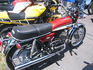 The RD350 is a two-stroke motorcycle produced by Yamaha from 1973 to 1975.[2] It evolved directly from the piston port (pre-reed valve intake tract), front drum-braked, five-speed Yamaha 350 cc "R5".[3]
