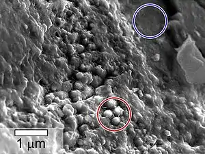 At a microscopic level, spheres are found in the meteorite that are rich in carbon compared to surrounding areas that lack such spheres. The carbon-rich spheres and the observed micro-tunnels may have been formed by biotic activity, according to NASA scientists.[2][5][6]