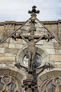 This 7-metre-high (23 ft) cross by Larhantec dates to 1869. The pedestal has reliefs depicting instruments of the passion. The cross carries inscriptions remembering particular "missions" or pilgrimages; that of 1869, 1906 and 1924. The cross is located in the cemetery. [4] [5]