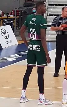 For the 2019–20 season, Nzosa was loaned to Stella Azzurra's affiliated team, Roseto Sharks of the Serie A2 Basket.[5] On 6 September 2019, he was picked up from his hotel by his mentor, Joe Lolonga, prior to a preseason training session, without the consent of his club to travel to Málaga and join Spanish club Unicaja Málaga.[1] Stella Azzurra filed a police report against Lolonga, who had been unhappy with the club's training of Nzosa, for kidnapping.[6] Nzosa announced on social media that he was moving to Unicaja and denied reports that he had been kidnapped.[7] He trained with Unicaja Andalucía, the reserve team of Unicaja competing in the Liga EBA, but was not allowed to play in professional matches due to a dispute between Unicaja and Stella Azzurra over his rights.[8][9] In December 2019, he represented the club's under-18 team at the ANGT Valencia Tournament, earning all-tournament team honors.[10][11]