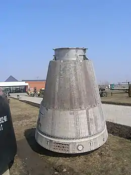 Yantar differed from Zenit in that it had to stay in orbit for a month unlike Zenit's 8–14 days. It also had 2 film return capsules, something it had in common with the US KH-7 GAMBIT reconnaissance satellite. Yantar had three parts: the aggregate/equipment module (AO - Agregatnyy Otsek), the instrument module (PO - Pribornnyy Otsek) and the special equipment module/special apparatus module (OSA - otsek spetsialnoy apparatury).[2][4] The special equipment module was the part that returned to earth at the end of the mission, and contained the Zhemchug-4 (pearl) camera. Each section was shaped like a truncated cone which gave the craft a conical shape.[4] The craft was 6.3m long[2] (although one source says 8.5m[4]) with a maximum diameter of 2.7m. It weighed 6.6 tonnes.[2]