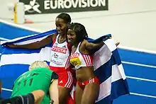 Savigne won her second major outdoor gold medal at the 2009 World Championships. Her jump of 14.95 m was enough to win in a modest competition which saw compatriot Mabel Gay take silver with 14.61 m.[1] The following year she won the silver medal at the 2010 IAAF World Indoor Championships, finishing behind Olga Rypakova who made the third longest indoor jump ever for the gold.[2] In the outdoor season, she improved her long jump best to 6.91 m in Reims at a meeting on the Alma Athlé Tour, despite having trouble with her right ankle. She remained focused on her triple jump speciality, however, aiming to return to her 2007 peak form.[3]