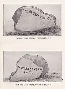 The Yarmouth Runic Stone, also known as the Fletcher Stone, is a slab of quartzite that first came to the attention of the public in the early 19th century.[1] The stone appears to have an inscription carved into it, which some investigators, notably Henry Phillips, Jr., have interpreted as Norse runes. This has led to speculation that the Yarmouth, Nova Scotia area, in Canada, was visited by Viking explorers sometime around 1000 C.E. Many other theories have been put forward, including the possibility of a hoax or the inscription being a product of natural forces. The stone is currently on display at the Yarmouth County Museum.