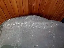 The Yarmouth Runic Stone is made of quartzite, measures 31" x 20" x 13" (79 cm x 51 cm x 33 cm), and weighs about 400 lbs. (180 kg).[2] It has a purported runic inscription carved near the top of one naturally smooth face; the stone does not appear to have been dressed in any way. The inscribed characters are between 1" and 1 1/2" (25mm - 40mm) high. There are small amounts of modern green paint on its lower surface from an earlier display stand, and someone has written the date "1007" in modern ink marker to the left of the inscription.