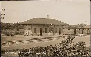 The original station was built in the village of Yarmouth Port when the Cape Cod Railroad extended its line from Sandwich to Hyannis in 1854.[1] In December 1865, the Cape Cod Central Railroad opened a branch from Yarmouth to Orleans, which was later extended to Provincetown.[2] It was destroyed by a fire on November 17, 1878; the Old Colony Railroad built a replacement.[1]