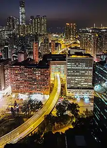 The Gascoigne Road Flyover, part of the West Kowloon Corridor, passes through the building.