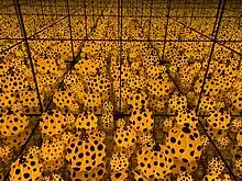 Kusama was raised in Matsumoto, and trained at the Kyoto City University of Arts in a traditional Japanese painting style called nihonga.[2] Kusama was inspired, however, by American Abstract impressionism. She moved to New York City in 1958 and was a part of the New York avant-garde scene throughout the 1960s, especially in the pop-art movement.[3] Embracing the rise of the hippie counterculture of the late 1960s, she came to public attention when she organized a series of happenings in which naked participants were painted with brightly coloured polka dots.[4][5] Since the 1970s, Kusama has continued to create art, most notably installations in various museums around the world.[6]