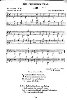 The hymn is most commonly set to[17] and was made famous by[18] the tune "St Fulbert" by Henry John Gauntlett, which first appeared in The Church Hymn and Tune Book (London, 1852). There it was used for the hymn "Now Christ, our Passover, is slain" and was known as "St Leofred". The editors of Hymns Ancient and Modern set Campbell's altered text to it and renamed it according to the original Latin author, adding a concluding "Alleluia! Amen".[6] A setting appears in the 1987 collection 100 Carols for Choirs, with the harmonisation from the English Hymnal (transcribed below)[13] and a last verse descant by David Willcocks.[19] An alternative tune is "Lyngham", a fuguing tune by 18th-century Englishman Thomas Jarman,[17] whose "astonishing and invigorating" choral-style polyphony echoes the first stanza instruction for "choirs" to employ their "sweetest notes".[10]