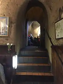 Ye Olde Trip to Jerusalem is a Grade II listed[1] public house in Nottingham which claims to have been established in 1189,[2] although there is no documentation to verify this date. The building rests against Castle Rock, upon which Nottingham Castle is built, and is attached to several caves, carved out of the soft sandstone.[3] These were reputedly originally used as a brewhouse for the castle, dating from the medieval period.