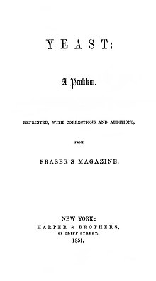 Yeast was first published in instalments in Fraser's Magazine, starting in July 1848, but as the radicalism of Kingsley's ideas became apparent the magazine's publisher took fright and induced the author to bring his novel to a premature close.[3] In 1851 it appeared in volume form.[7]