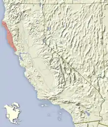 The yellow-cheeked chipmunk is endemic to the coast region of northern California, where it is present in a strip of land nowhere wider than 40 km (25 mi). The southern end of its range is a few kilometers north of Bodega Bay and Freestone in Sonoma County and the northern end is the Eel River in Humboldt County. It occurs at altitudes up to 1,280 m (4,200 ft) in the humid coastal strip of coniferous forest where an understory of shrubby growth occurs.[3]