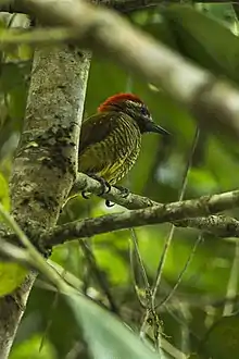This woodpecker is usually seen singly or in pairs, or occasionally in small groups of mixed species. It forages for invertebrates in the twigs and outer branches in the middle and upper parts of the canopy. Its breeding habits are poorly known but it is believed to nest between March and August.[3]