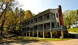Yellow Sulphur Springs is a historic resort complex located near Christiansburg, Montgomery County, Virginia. The complex includes the main building; proprietor's cottage (1870s); three rows of cottages formerly denominated the Petersburg, Memphis, and Spring Hill rows; a carriage house(no longer standing); and the site of a man-made lake and 19th century bowling alley (in ruins). Though established in the 1700s, the original section of the current main building was built about 1810, and expanded in 1840. The inn was mentioned in local records as far back as the late 1700s, before nearby Blacksburg, Virginia was established.[3] It is a two-story, eight bay frame hotel building set upon a full basement. The building features a two-story portico with square Roman Doric piers stretches the length of the weatherboarded structure.[4] The cold mineral spring water on the property is rich in minerals and doctors prescribed it to their patients.[3]
