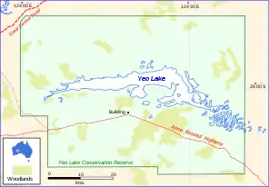 Yeo Lake is an ephemeral salt lake in the south of Western Australia, lying in the Great Victoria Desert east of Cosmo Newberry.[1] The Anne Beadell Highway runs along its southern margin, and the Great Central Road lies further to its north. Its surface elevation is 349 metres above mean sea-level.[2]