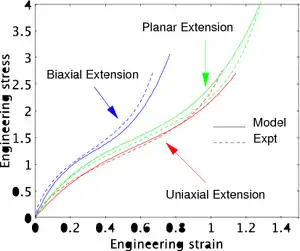 Planar extension tests are carried out on thin specimens which are constrained from deforming in one direction. For planar extension in the directions with the direction constrained, the principal stretches are . From incompressibility . Hence . Therefore,