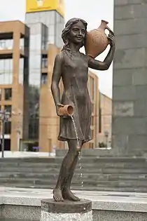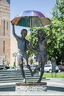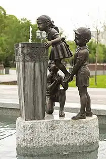 Seven bronze statues are installed in the park which were ordered and created especially for the Yerevan 2800th Anniversary park. The entrance of the park is decorated with bull and lion bronze statues made by analogy with the frescoes of Erebuni fortress. In four corners of the fountain which has the form of the map of Yerevan there are four bronze statues of children (“Imagination”, “Happiness”, “Caring”, “Chastity”), as well as there is a statue of a child with a boat (“Childhood”) on the site symbolizing the Yerevan lake. The statues represent the images of children of Yerevan city of the 1970s and 1980s.[8]