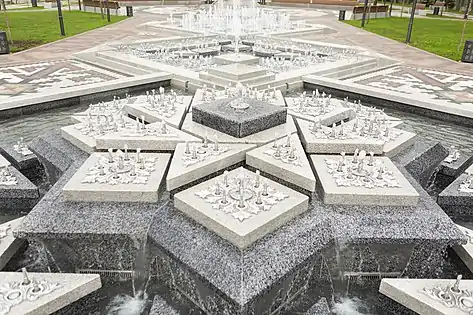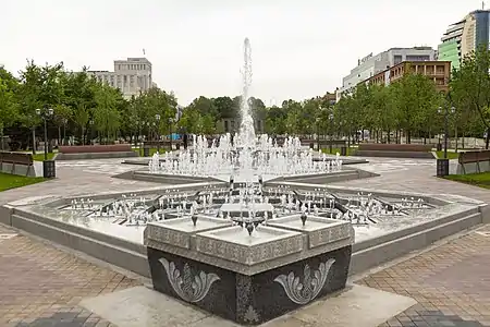 In the park there are 5 types of fountains with multicolored lighting and granite basins: pedestrian, with ascending waters, rotating, sparkling and arched. The basins of all the fountains in the park are made of 2 color granite tiles. Granite tiles are engraved with Armenian traditional ornaments.