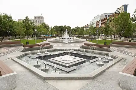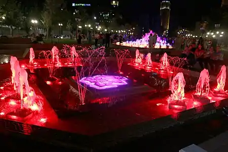 A square, engraved in the form of the smaller scale map of Yerevan city, with its 45 rising water jets was also constructed in the park. It is equipped with four sensors that enable changing the dynamics of the fountain by touching. In the evening, the area is surrounded by illuminated colorful fog, periodically emerging from the surface of the ground. Hrazdan river with its 4 bridges is also symbolized on the map in blue granite.