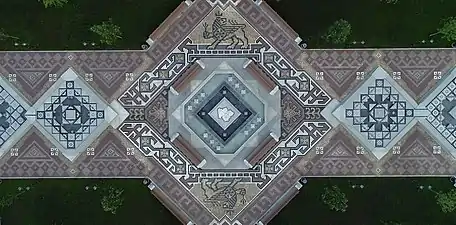 In the center of the pavement there is a narrow oblong rug path decorated with patterns of Armenian carpets. The decoration system of carpets, particularly of “ Chartar” type, characterized by interconnected chains of diamond-shaped large creations is in the base of the rug structure. The main composition of the late period dragon carpet of “Khndzoresk” type is represented. It contains the symbol of the Sun representing the eternal conflict between good and evil and eight stylizations of the Dragon surrounding the Sun. The patterns of the “tree of life” initiated from the Sun symbol represent the victory of good and the idea of eternal life. The linear version of the central sector of the dragon carpet “Guhar” woven in 1680 is in the center of the large diamond-shaped ornament. The corners are decorated with stylized dragon figures typical to the late period-dragon carpets of “Masyatsotn” type, and with stepped diamond-shaped patterns typical to “Chartar” type carpets.