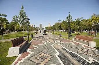 The ornaments and aluminum patterns on the granite surfaces of the architectural elements in the park are made with patterns of famous architectural monuments created by Alexander Tamanian, Jim Torosian, Rafayel Israyelian, Stepan Kurkchian and Mark Grigorian. At the end of the park there is Alexander Miasnikian’s statue (sculptor Ara Shiraz, architect Jim Torosian), erected in 1980. Anyway, Alexander Miasnikian’s statue has no connection with the Yerevan 2800th Anniversary Park, which is under the jurisdiction of Yerevan Municipality. The statue is maintained by the Ministry of Culture of Armenia.