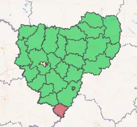 Yershichsky District (Russian: Ершичский райо́н) is an administrative[1] and municipal[4] district (raion), one of the twenty-five in Smolensk Oblast, Russia. It is located in the south of the oblast and borders with Roslavlsky District in the north, Dubrovsky District of Bryansk Oblast in the east, Kletnyansky District, also of Bryansk Oblast, in the south, Khotsimsk District of Mogilev Region of Belarus in the southwest, Klimavichy District of Mogilev Region in the west, and with Shumyachsky District in the northwest. The area of the district is 1,039.00 square kilometers (401.16 sq mi).[1] Its administrative center is the rural locality (a selo) of Yershichi.[1] Population: 7,102 (2010 Census);[2] 8,859 (2002 Census);[6] 11,544 (1989 Census).[7] The population of Yershichi accounts for 44.6% of the district's total population.[2]