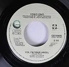 "Yes, I'm Your Angel", also known as "I'm Your Angel", is a song written by Yoko Ono that was first released on Ono's and John Lennon's 1980 album Double Fantasy. It was later released as the b-side of Lennon's single "Watching the Wheels." The initial release of Double Fantasy used the title "I'm Your Angel" but later releases as well as the single used the title "Yes, I'm Your Angel."[1]