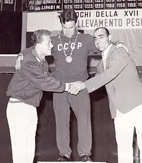 ![]() Isaac Berger, Yevgeny Minayev and Sebastiano Mannironi at the 1960 Olympics | |||||||||||||||||||||||||||||